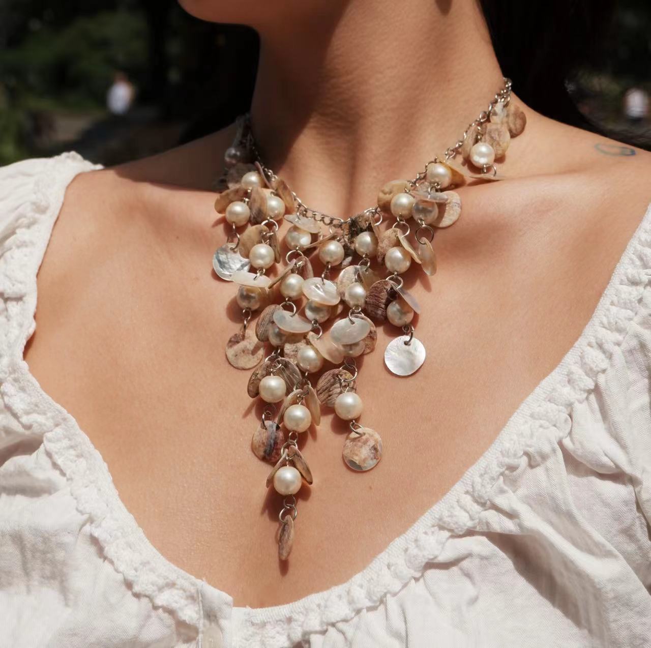 So in my creation I use quartz, pearls as decoration hang around the chasing pieces and shells are swing under the necklace.